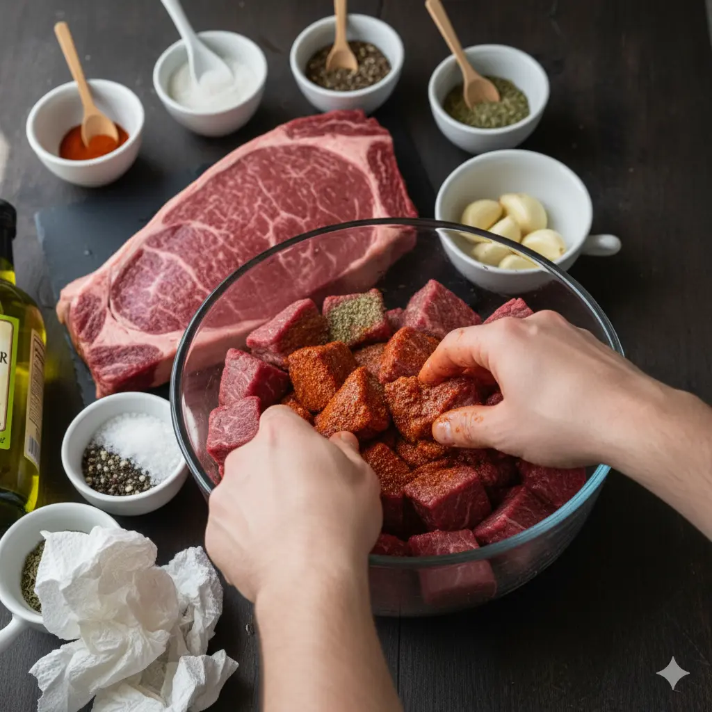 In a large mixing bowl, combine the cubed steak with avocado oil, Worcestershire sauce, garlic powder, onion powder, smoked paprika, salt, pepper, and oregano. Using your hands (the best tool for even coating), massage the seasonings into every surface of the beef. The oil acts as both a flavor carrier and helps achieve that golden-brown exterior.