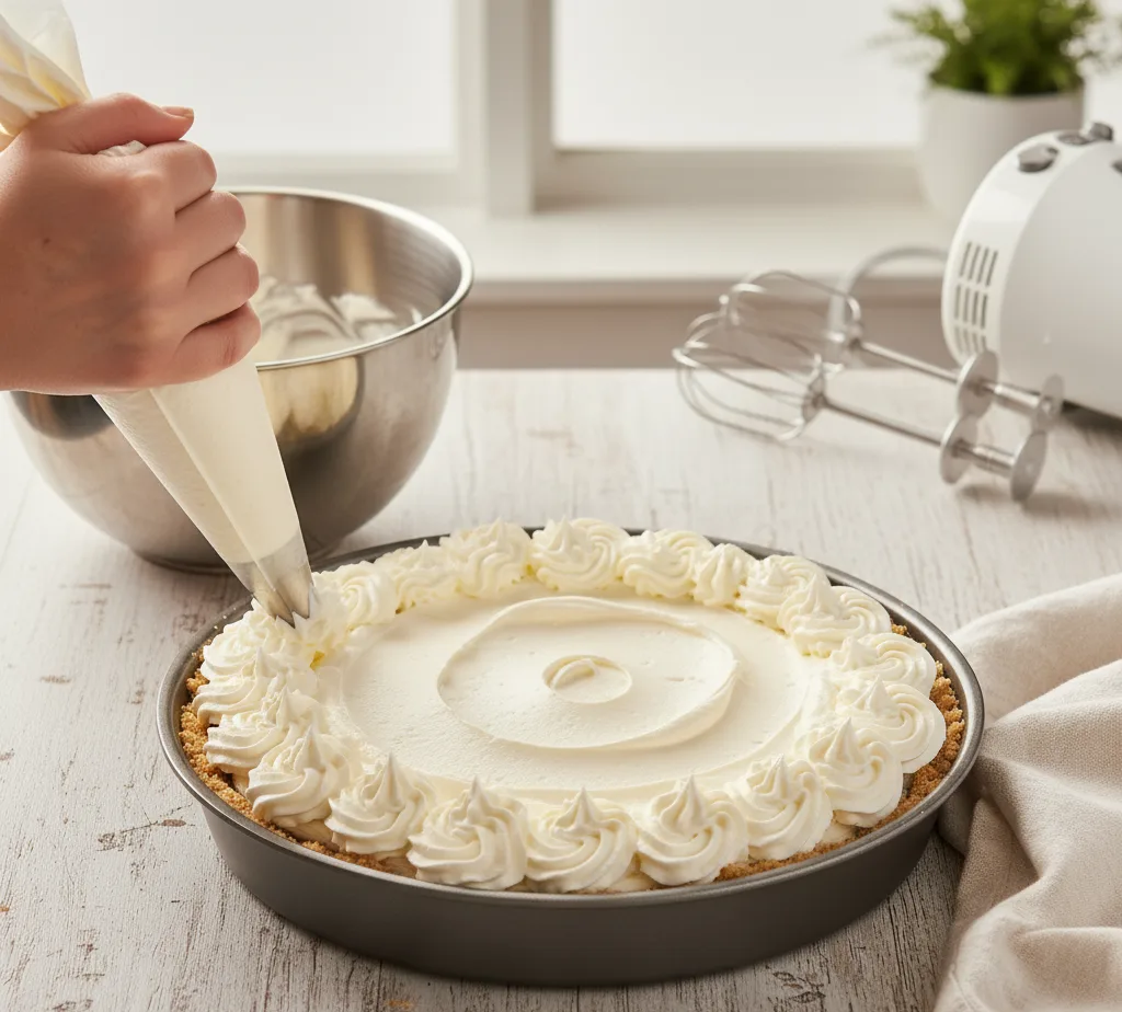 Be careful not to over-whip, which turns cream into butter—stop when you can create peaks that stand upright but still have a slight curve at the tip. Using a spatula or piping bag fitted with a large star tip, spread or pipe the whipped cream generously over the fruit layer, creating dramatic swirls and peaks that catch the light beautifully. For an extra-professional touch, pipe rosettes around the edge of the pie.