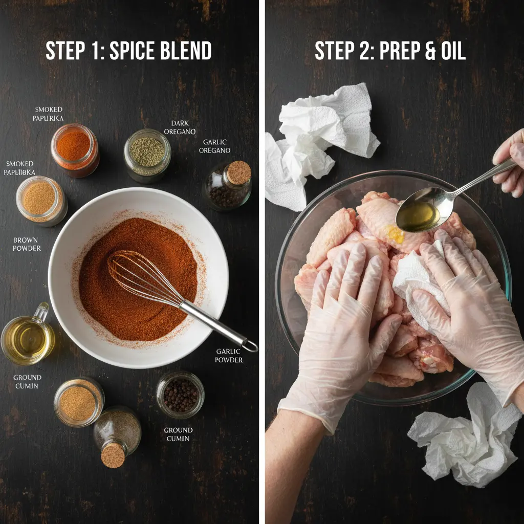 Technique Insight: Some pitmasters swear by a preliminary coating of baking powder (about 1 teaspoon per pound of wings) mixed with the oil before applying the rub. The alkaline baking powder raises the pH of the skin, accelerating browning and creating an exceptionally crispy texture. This is optional but highly recommended for air fryer or oven-baked wings.