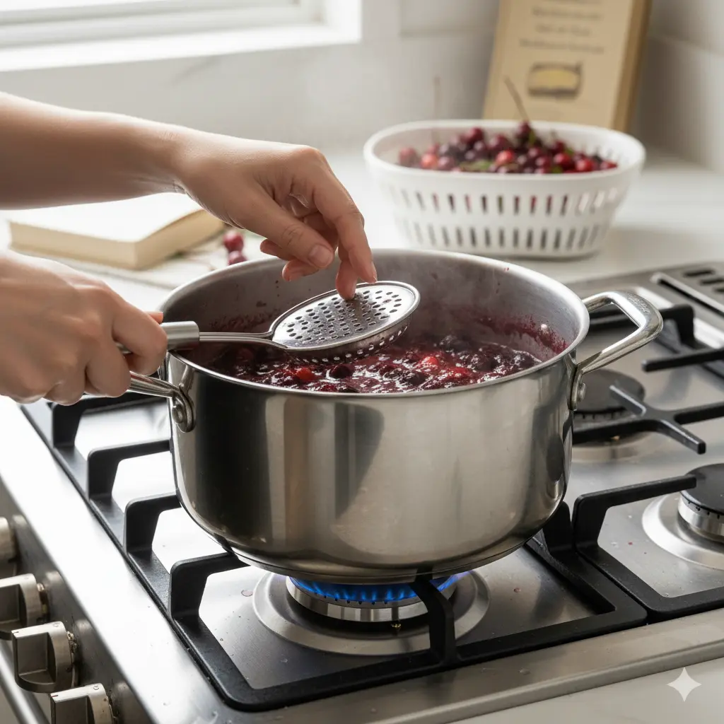 The berries will release their deep burgundy color and characteristic aroma—slightly tart with notes of almond from the pits (which is completely safe when cooked). You’re aiming for the berries to be completely broken down and the liquid to have reduced by about one quarter.