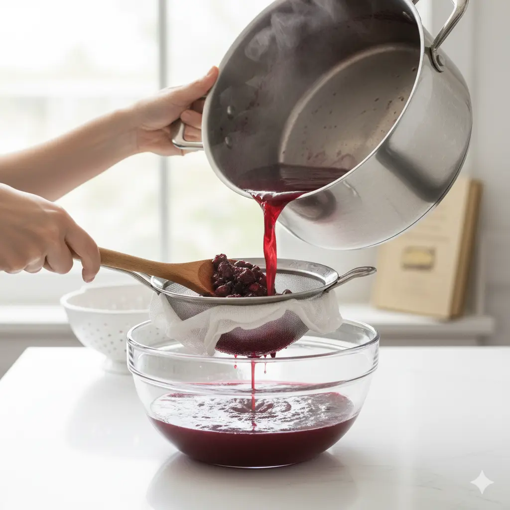 Set a fine-mesh strainer or cheesecloth-lined colander over a large bowl or second saucepan. Carefully pour the hot chokecherry mixture through the strainer, pressing firmly on the solids with the back of a ladle or spoon to extract maximum juice. You should yield approximately 3 to 3½ cups of deep purple-red chokecherry juice.