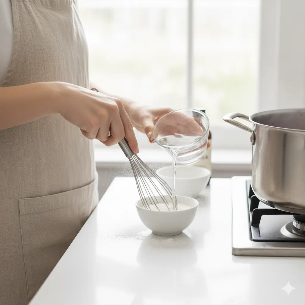 In a small bowl, whisk together the cornstarch and ½ cup cold water until completely smooth with no lumps visible. This slurry technique prevents clumping and ensures even thickening throughout your pudding. Let it sit for 1-2 minutes—you’ll notice the cornstarch settling to the bottom, so give it one final whisk right before adding it to the hot liquid.