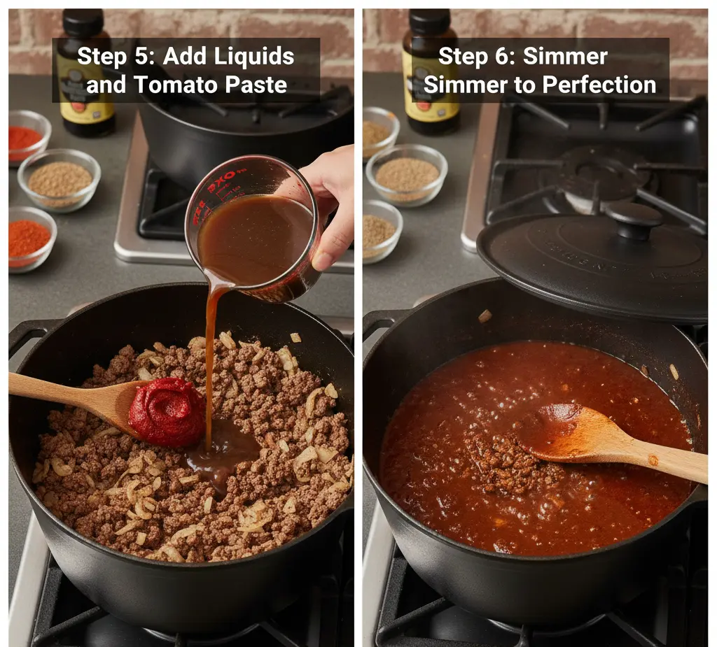 Stir in the tomato paste, ensuring it’s thoroughly incorporated with the meat and spice mixture. Cook for 2 minutes, stirring constantly—this caramelizes the tomato paste and removes any raw, metallic taste. Next, slowly pour in the beef broth and water while stirring continuously. Add Worcestershire sauce. The mixture will look quite loose at this stage, almost soup-like. Don’t worry—it will reduce and thicken substantially during simmering.