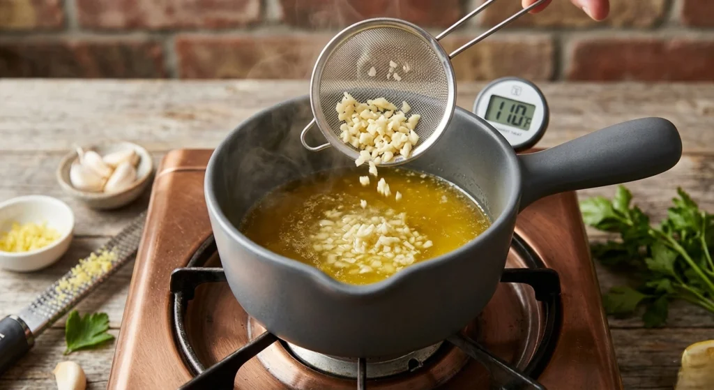 Add the minced garlic to the warm butter. Let it “steep” for about 2 minutes on the lowest heat setting. This removes the harsh raw bite of the garlic and permeates the fat with its oils. This is the stage where semantic flavors are built.