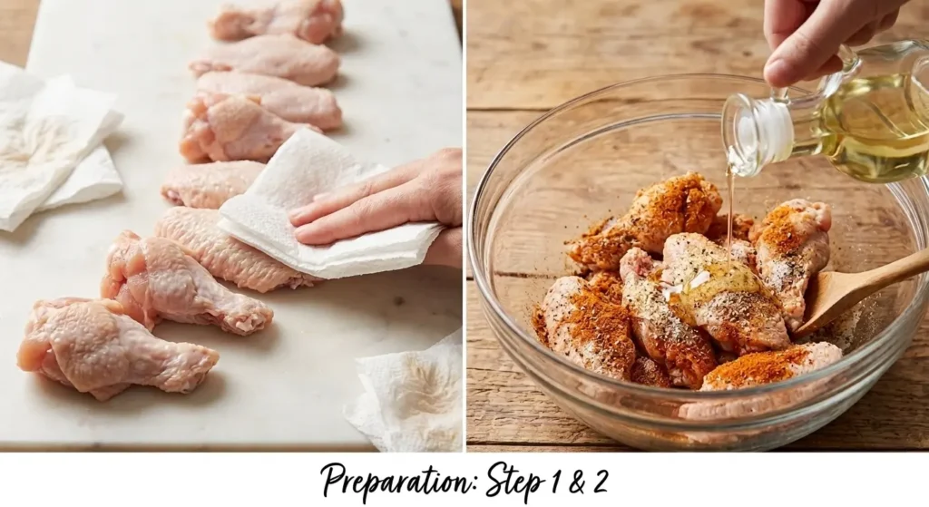Remove your wings from packaging and place them on a clean cutting board. Pat every single wing completely dry using paper towels — and we mean completely. Press firmly on all sides of each piece. Moisture is the mortal enemy of crispy skin; if you skip or rush this step, even the best recipe in the world won’t save your wings.