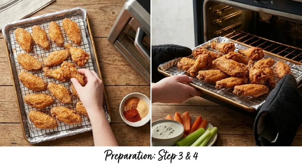 Place a wire cooling rack on top of a rimmed baking sheet lined with aluminum foil. Arrange the seasoned wings in a single layer on the rack, making sure they don’t touch or overlap. The rack elevates the wings so hot air circulates underneath them — this means you’re essentially oven-frying them, getting crispy skin on all sides without deep-frying.