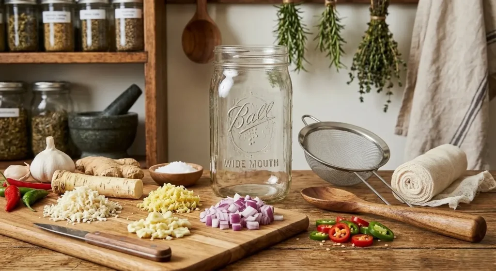 You’ll need a wide-mouth quart-size (32 oz) mason jar, a sharp grater or food processor, a wooden spoon or muddler, cheesecloth or a fine mesh strainer, and a dark glass bottle for storage. Sterilize your jar by running it through the dishwasher on high heat, or submerging it in boiling water for 10 minutes. This isn’t just good practice, it’s essential for preventing unwanted mold or bacterial growth during the 4-week steep.