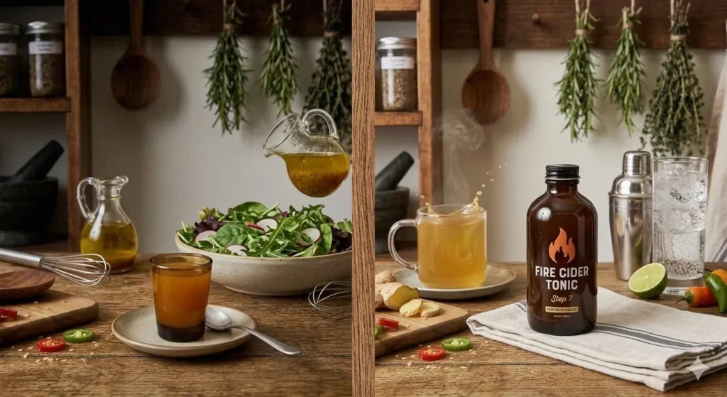 Store your finished fire cider in the refrigerator, where it will keep for up to one year. The high acidity of the apple cider vinegar acts as a natural preservative. The standard daily serving is 1β2 tablespoons taken straight as a morning shot, or diluted in 4β6 oz of warm water, juice, or sparkling water. Many people also use fire cider as a salad dressing base, marinade ingredient, or cocktail/mocktail mixer.