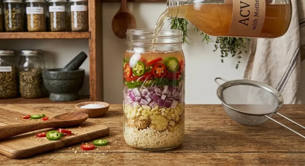Pour raw, unfiltered apple cider vinegar with the ‘mother’ over all the ingredients until they are completely submerged β typically 2 to 3 cups for a quart jar. The ‘mother’ refers to the beneficial bacterial strands visible in unfiltered ACV and is key to this fire cider recipe’s probiotic benefits. Brand recommendation: look for organic, unfiltered ACV with visible sediment at the bottom.