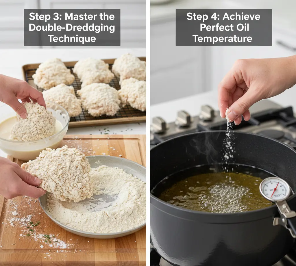 Here’s the game-changing step: return the coated thigh to the buttermilk for 3 seconds, then dredge it through the flour mixture a second time, pressing the coating onto the chicken to ensure maximum adhesion. Place the double-coated thigh on a wire rack set over a baking sheet. Repeat with remaining pieces.