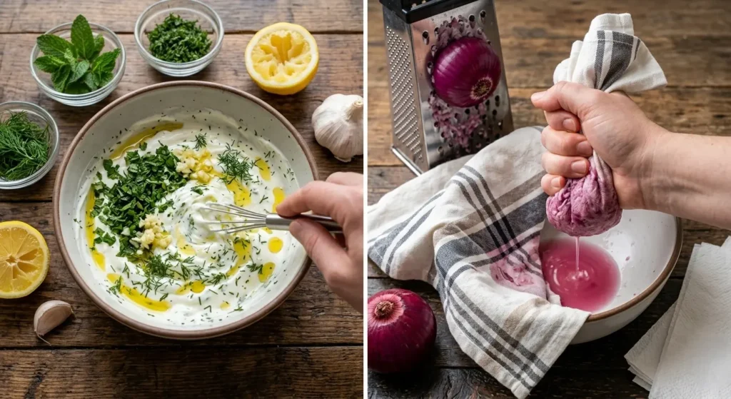 Start with the sauce so the flavors have time to marry while you prepare everything else. In a medium bowl, combine the Greek yogurt, mint, dill or parsley, minced garlic, and lemon juice. Season generously with salt and pepper, then drizzle with olive oil. Stir well, taste, and adjust acidity or seasoning. Cover and refrigerate until needed. The sauce keeps beautifully for up to 3 days.