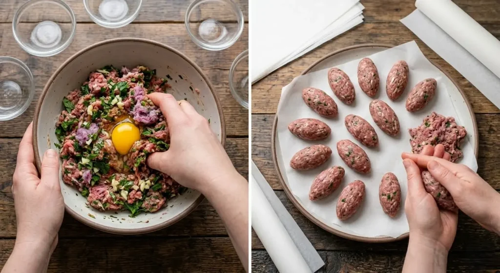 Add the ground lamb, squeezed onion, minced garlic, parsley, mint, cumin, coriander, smoked paprika, cinnamon, cayenne, salt, pepper, and egg yolk to your mixing bowl. Using clean hands, mix everything together firmly but not aggressively for about 60 to 90 seconds. You’re looking for a cohesive, evenly spiced mixture where the herbs and aromatics are visibly distributed throughout. Don’t overwork it or the fat will begin to separate and the texture will become dense.