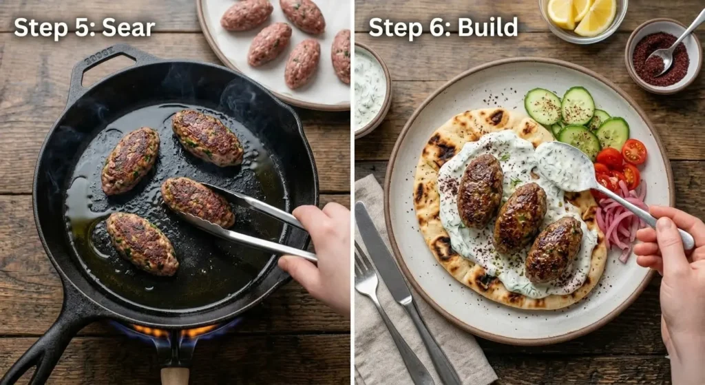 💡 Pro Tip: A cast iron or stainless steel pan will give you superior browning compared to nonstick. Resist the urge to move the kofta in the first 2 minutes or they will tear and stick.