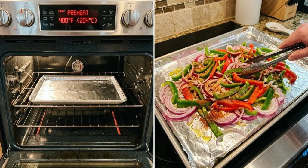 Line a large rimmed baking sheet with aluminum foil for easy cleanup, or use a cast iron skillet for superior heat retention and browning. Add your sliced onions and bell peppers to the pan. Drizzle with olive oil, then sprinkle with garlic powder, smoked paprika, salt, and pepper. Toss everything together until the vegetables are evenly coated in that fragrant, crimson-hued spice blend.