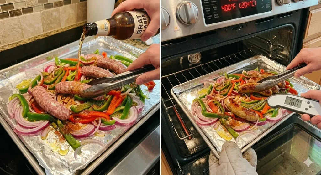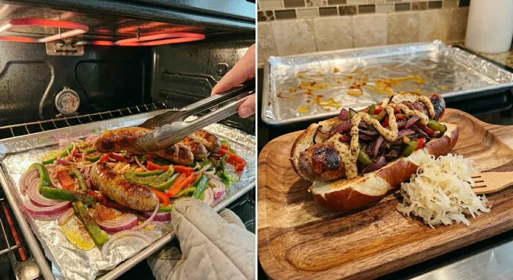 Slide your sheet pan into the preheated oven. Roast for 10–12 minutes, then use tongs to carefully flip each brat. This ensures both sides develop that appealing caramelized crust. Return to the oven and cook for another 10–13 minutes.