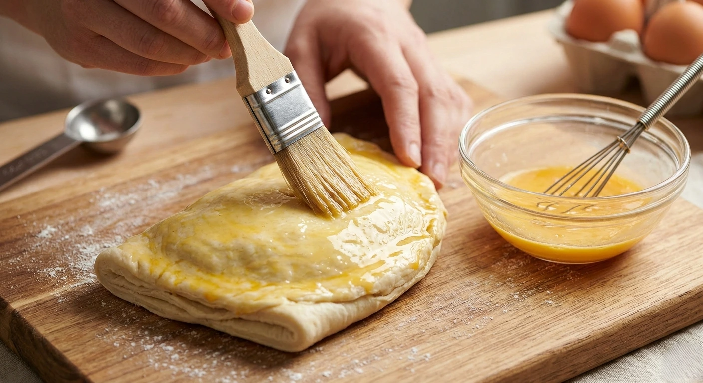 Dip your pastry brush into the egg wash and apply a thin, even layer across the surface of your dough, pastry, or bread. Work in gentle, sweeping strokes from the center outward. Avoid pooling in crevices or along cut edges — excess egg wash in those areas can seal together layers of puff pastry or create a rubbery skin on bread seams.