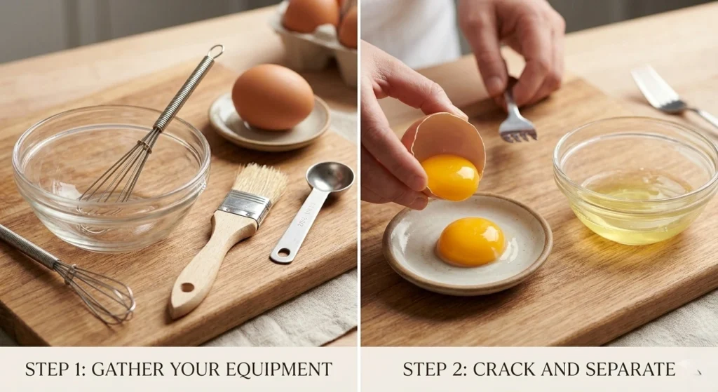 Before you crack a single egg, set yourself up for success. You’ll need a small bowl (glass or ceramic is ideal — avoid reactive metals), a fork or small whisk, a pastry brush (silicone is easiest to clean; natural bristle gives a slightly softer application), and a small liquid measuring spoon.