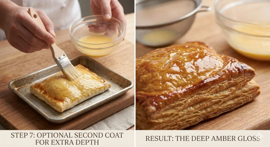 For the deepest, most bakery-worthy color, apply a second thin coat of egg wash approximately halfway through your bake — typically after 10–15 minutes in the oven. This layered technique is the professional pastry chef’s secret to that irresistible deep amber gloss.