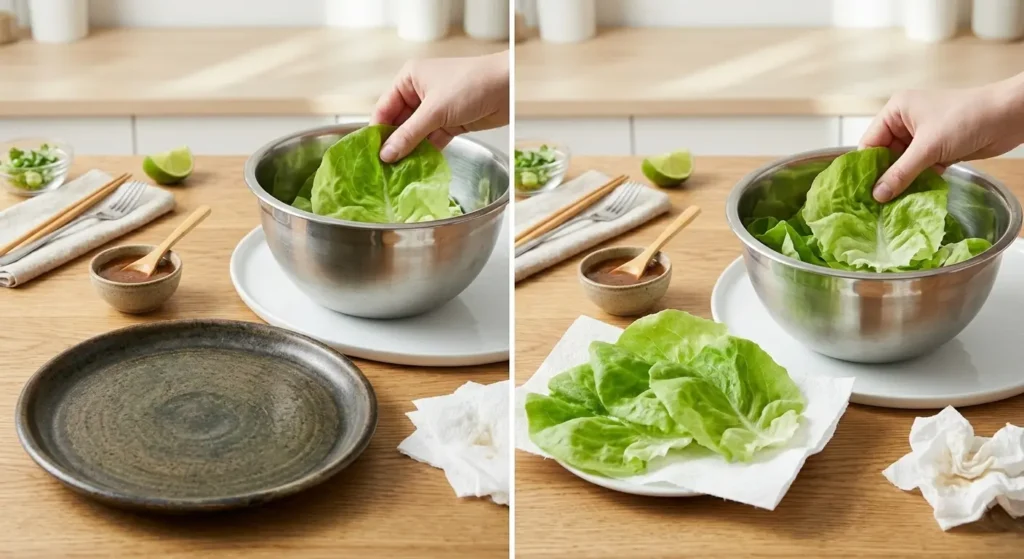Carefully separate the butter lettuce leaves, choosing the most cup-shaped ones. Rinse them under cold water, then gently pat dry with paper towels or spin in a salad spinner. Lay them out on a platter. Doing this ahead means your lettuce cups are ready the moment the filling is done — no one wants a hot filling cooling down while you wrestle with wet lettuce leaves. Refrigerate the prepared cups while you cook to keep them crisp and cool — that temperature contrast with the warm filling is magical.
