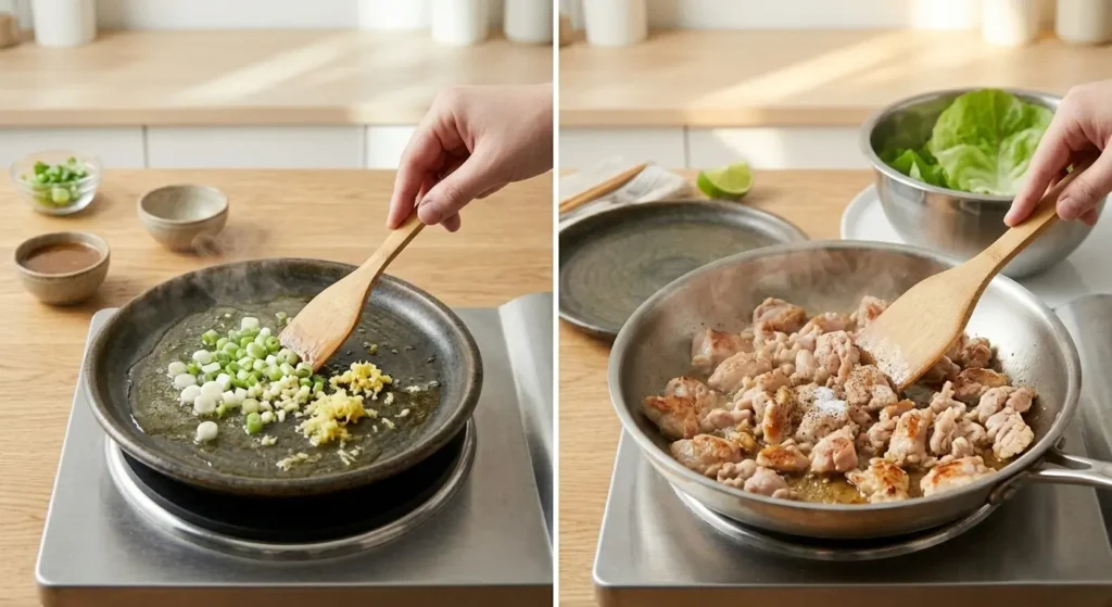 Add the ground chicken to the pan and break it up with a wooden spoon or spatula. Cook over medium-high heat for 5–6 minutes, breaking the meat into very small, crumbled pieces as it cooks. You’re aiming for golden-brown bits, not gray steamed meat — so resist the urge to stir too frequently. Let it sit undisturbed for 30–60 seconds at a time to get proper browning. This Maillard reaction is where incredible flavor is built. Season lightly with a pinch of salt and white pepper.
