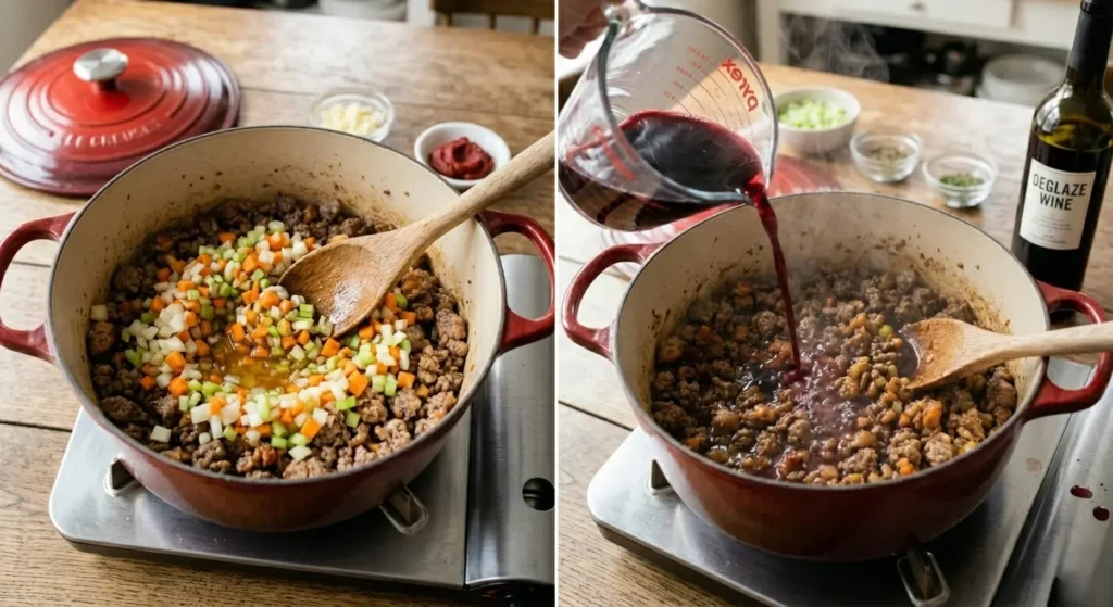Push the browned meat to the sides of the pan and reduce heat to medium. Add the remaining tablespoon of olive oil to the center, then add your diced onion, carrot, and celery. Cook, stirring occasionally, for 6–8 minutes until the vegetables are softened and translucent. Add the minced garlic and tomato paste, stirring constantly for 2 minutes — this toasts the paste, removing its raw edge and deepening the umami backbone of your meat sauce.