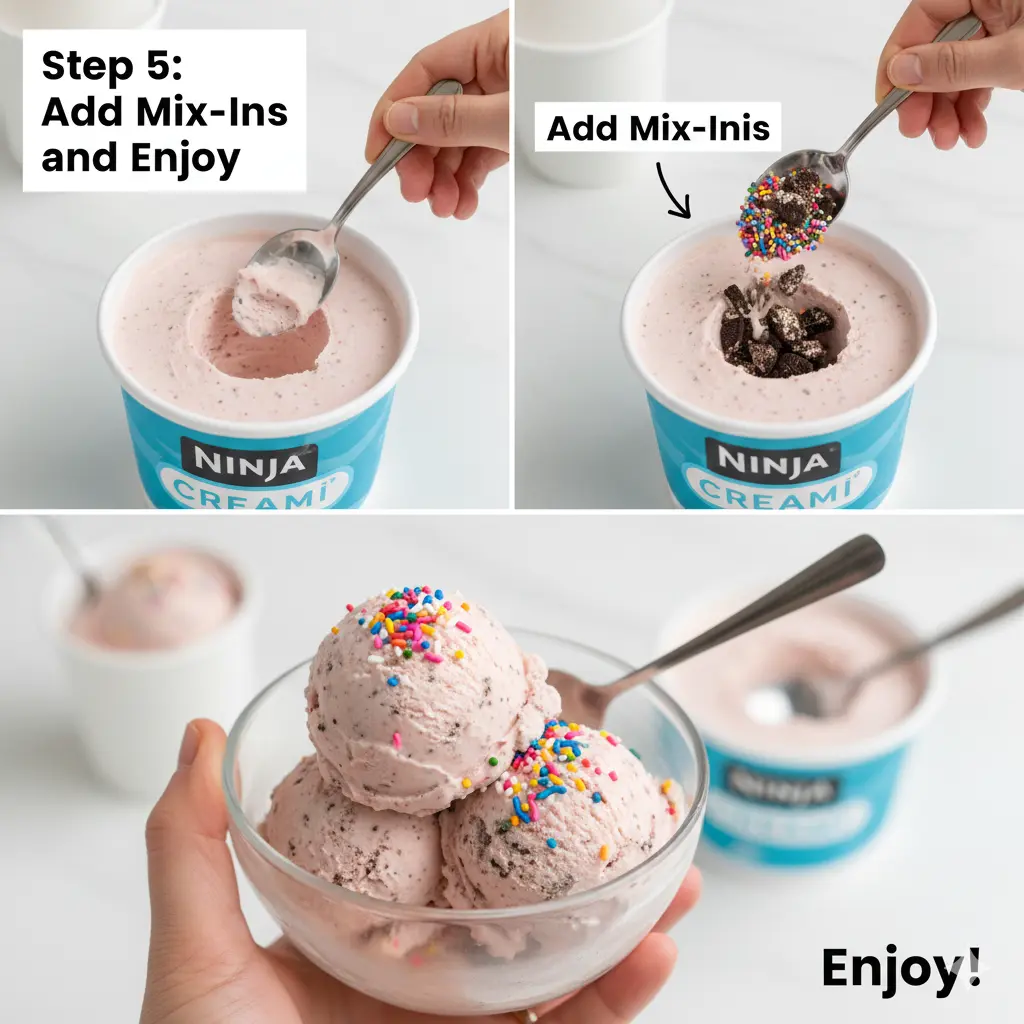 If your recipe includes mix-ins like cookie chunks, candy pieces, or swirls, now is the perfect time to incorporate them. Create a shallow hole in your processed ice cream and add your desired mix-ins (typically ΒΌ to Β½ cup total).